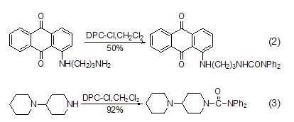 與氨基的反應(yīng) dpc-cl易與一級(jí) (式2)[2]、二級(jí)脂肪胺 (式3)[3] 等反應(yīng)[4~7]。