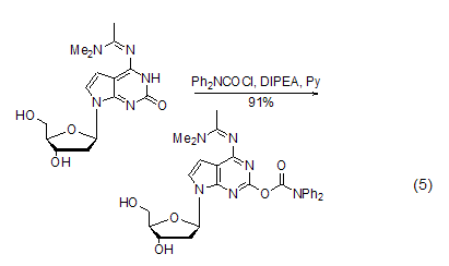 用作寡聚核苷酸合成時(shí)的保護(hù)基 在合成寡聚核苷酸時(shí),鳥嘌呤核苷的堿基容易發(fā)生副反應(yīng),需要加以保護(hù),dpc-cl可以將鳥嘌呤堿基的烯醇異構(gòu)體酰基化而對(duì)其進(jìn)行保護(hù),這種方法在合成具有鳥嘌呤堿基和與鳥嘌呤堿基類似的核苷化合物時(shí)[9~12],發(fā)揮著重要作用 (式5)。